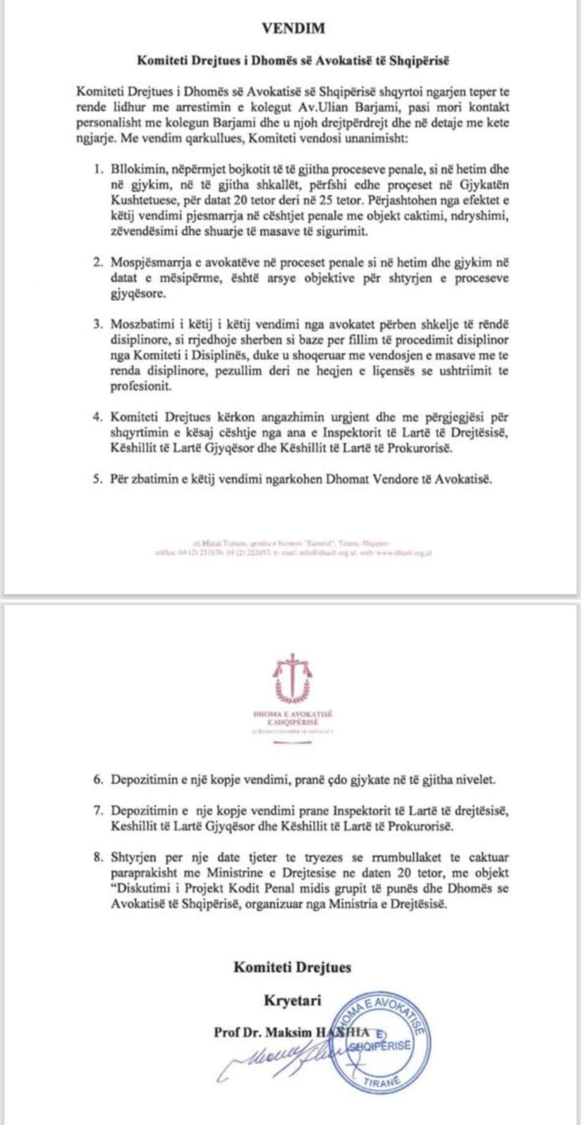 Tiranë, 19 tetor 2025 Komiteti Drejtues i Dhomës së Avokatisë së Shqipërisë ka marrë një vendim të jashtëzakonshëm pas arrestimit të avokatit Uljan Barjami, duke shpallur bojkot kombëtar të të gjitha proceseve gjyqësore nga data 20 deri më 25 tetor 2025.Sipas vendimit, avokatët në të gjithë vendin do të pezullojnë pjesëmarrjen në çdo seancë gjyqësore penale, civile dhe administrative, në të gjitha shkallët, përfshirë edhe Gjykatën Kushtetuese. Përjashtohen vetëm seancat për caktim apo shuarje të masave të sigurimit.Komiteti e cilëson ngjarjen “tepër të rëndë” dhe ka kërkuar angazhimin urgjent të institucioneve të drejtësisë, përfshirë Inspektorin e Lartë të Drejtësisë, Këshillin e Lartë Gjyqësor dhe Këshillin e Lartë të Prokurorisë.Gjithashtu, moszbatimi i vendimit të bojkotit nga ndonjë avokat do të konsiderohet shkelje e rëndë disiplinore, me pasoja që mund të çojnë deri në pezullim apo heqje licence.Në shenjë proteste, Dhoma e Avokatisë ka njoftuar edhe shtyrjen e tryezës me Ministrinë e Drejtësisë, e planifikuar më 20 tetor për diskutimin e Projekt Kodit Penal.Vendimi është firmosur nga Prof. Dr. Maksim Haxhia, kryetar i Komitetit Drejtues të Dhomës së Avokatisë së Shqipërisë.